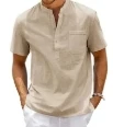 This light blue shirt is a great mix of comfort and style. The stand collar and half-button placket give it a clean, modern look, while the chest pocket adds a practical touch. Made from lightweight fabric, it feels breathable and relaxed—perfect for warm days. The curved hem and soft texture make it versatile enough to wear untucked with shorts or dressed up with chinos.