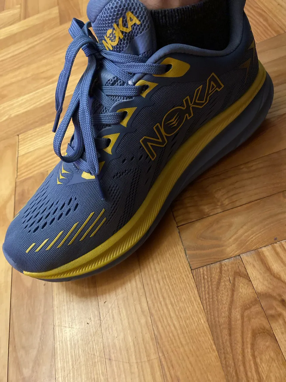 While these are an obvious attempt at a hoka knock off, i bought them just for fun. I needed a pair of black shoes and wanted to try these for under 30 bucks. They fit just a tiny bit smaller than they should, but it’s ok for what i wear them for. They are actually fairly comfortable, and if they are still around, i would recommend them for light walking and sitting around while wearing a pair of black shoes. I wouldn’t recommend running in them, and will have to see over time how they hold up.