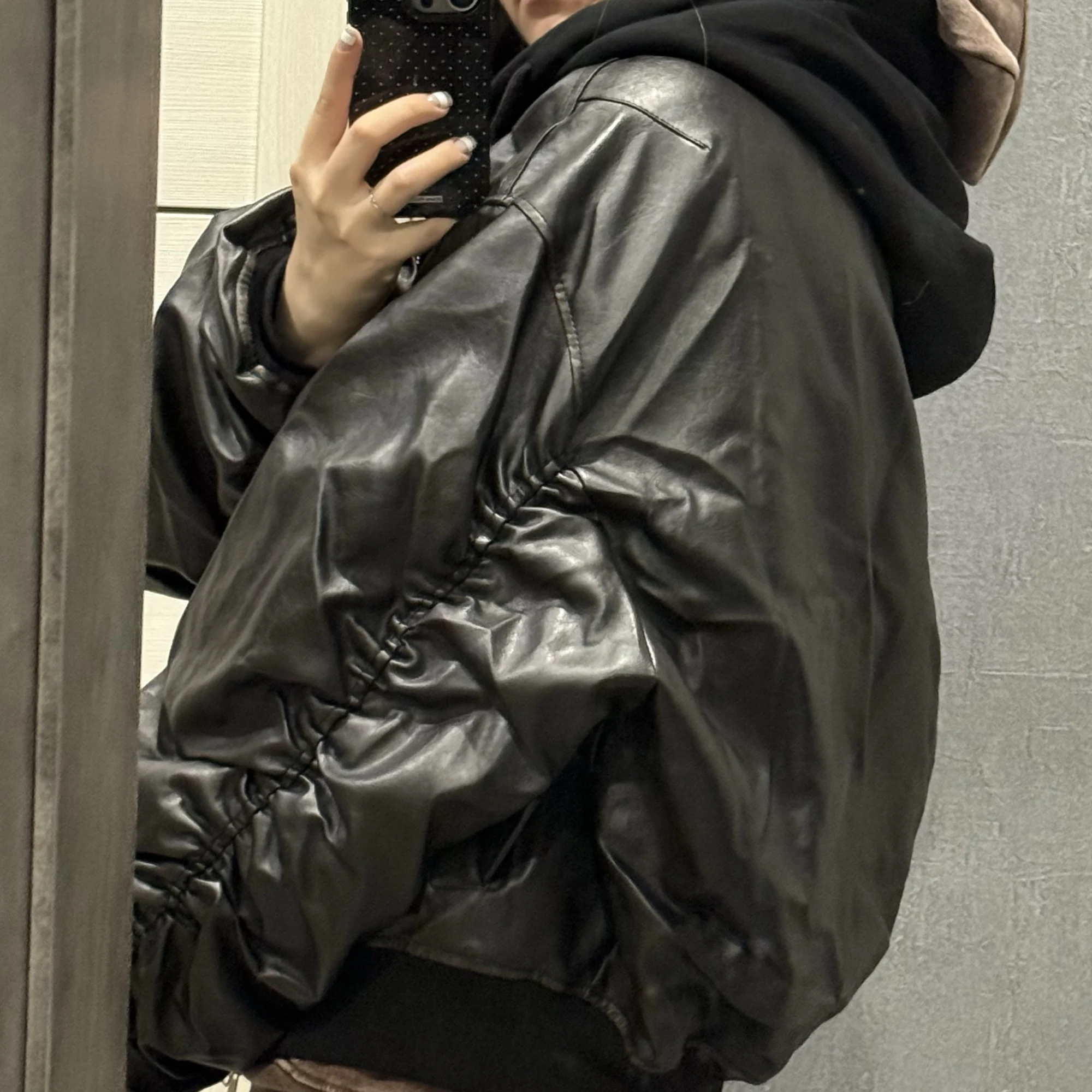 On my husband, size M fits perfectly, not too big or too small, there's room to wear a sweater or hoodie underneath. It's perfect for autumn and spring. Hood made of thick fabric, gray part of the jacket is faux leather, does not get wet in the rain.