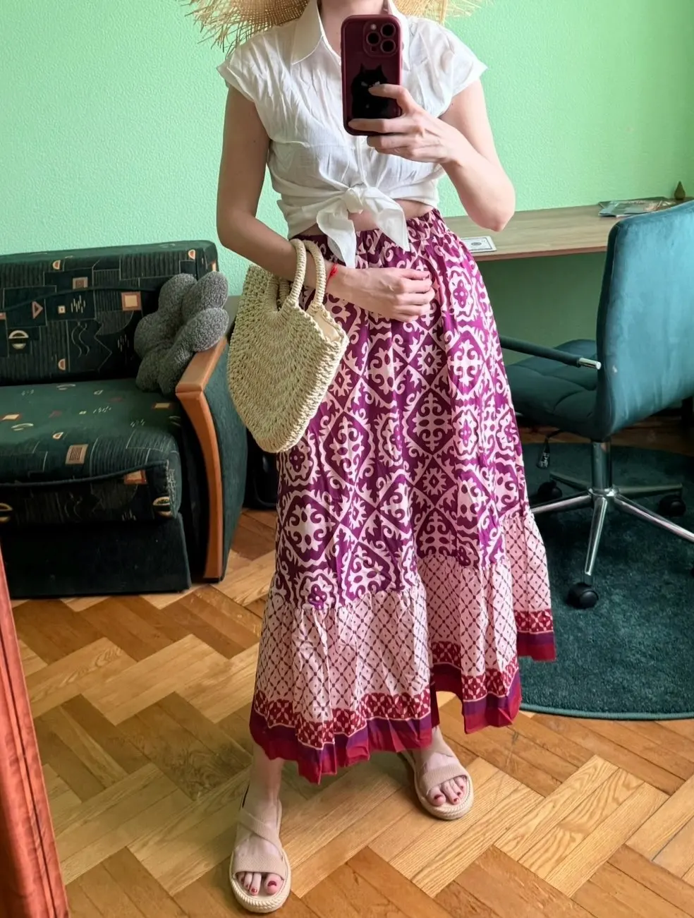 It looks very nice when worn, and the color highlights the skin tone. The fabric is cool, the only thing is that it needs to be ironed, even a little.